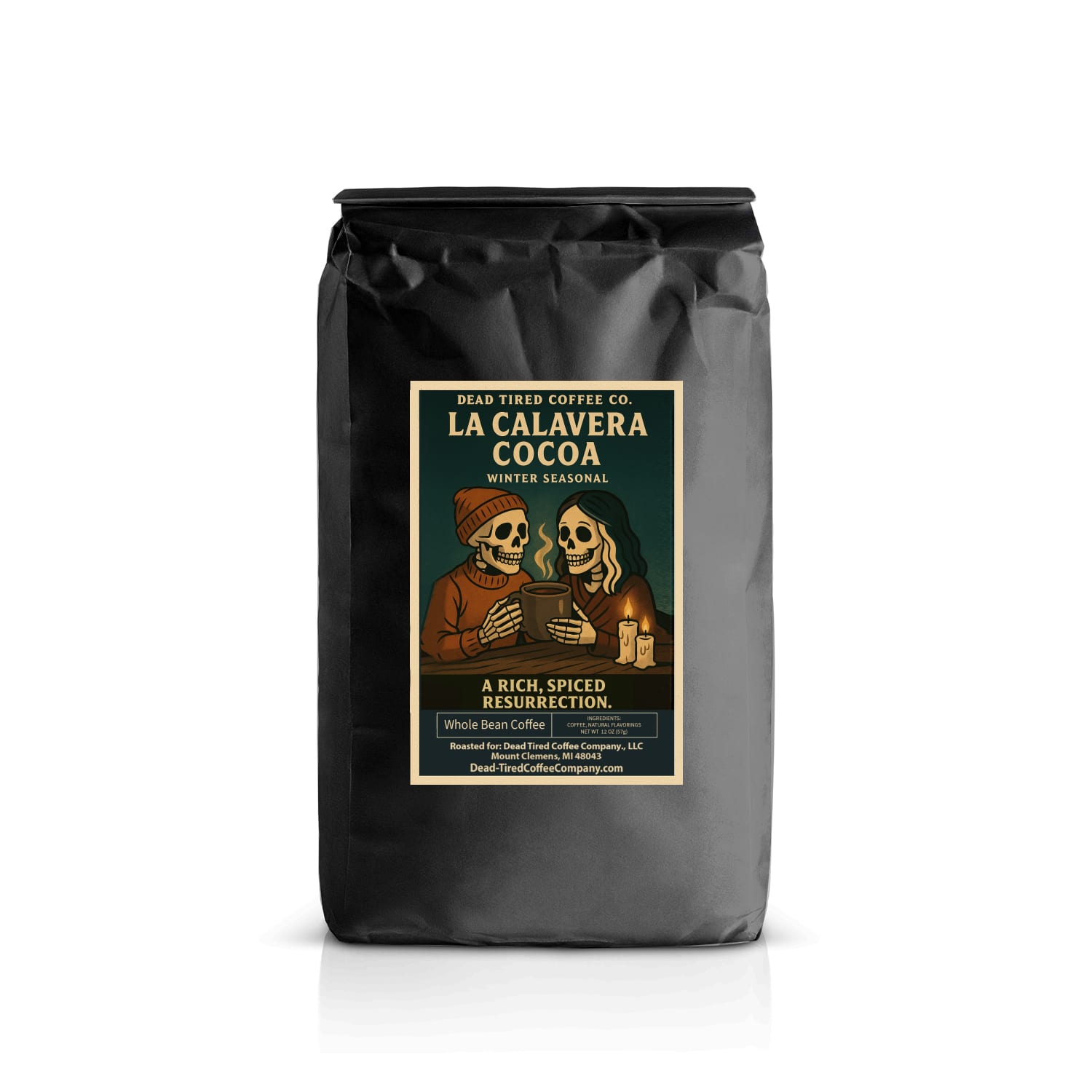 A smooth medium roast with a touch of dark magic — La Calavera Cocoa blends chocolate, cinnamon, and vanilla into a cup that’s equal parts comfort and chaos.
